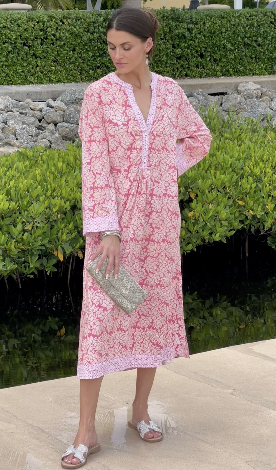 This ankle length print kaftan is a dream to wear. The perfect cover-up for beach or poolside glam…it is ideal for chic summer lounging. Great to throw on after the shower or first thing in the morning for coffee and quiet time. Sigrid’s original Kauai Flower block print is accented by our Trellis Print on the cuff, hem and half placket. Sides slits and pockets complete the look. Made in super soft rayon, available in 2 colors: rose and blue.