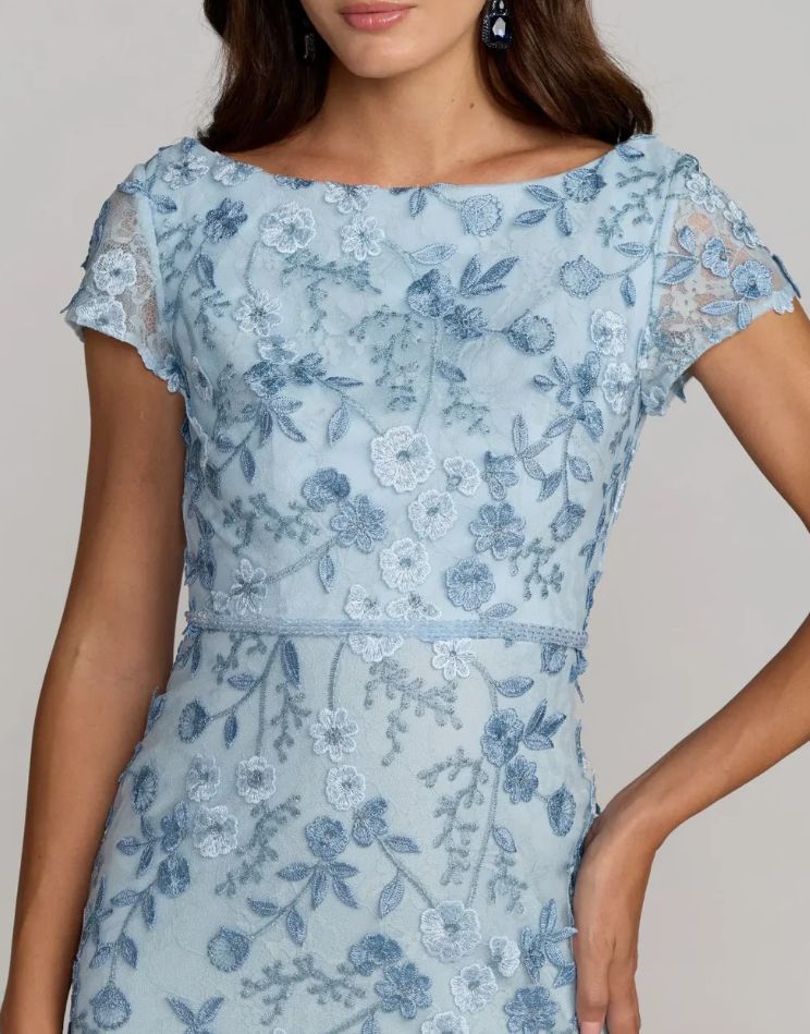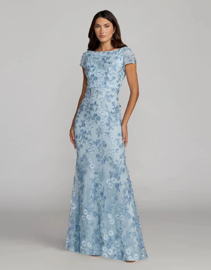 Mac Duggal Blue Floral Applique Boat Neck Cap Sleeve Gown | Style 67711