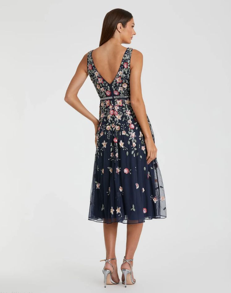 Mac Duggal Navy V-Neck Sleeveless Midi Floral Beaded A-line Dress | Style #5527 – FINAL SALE