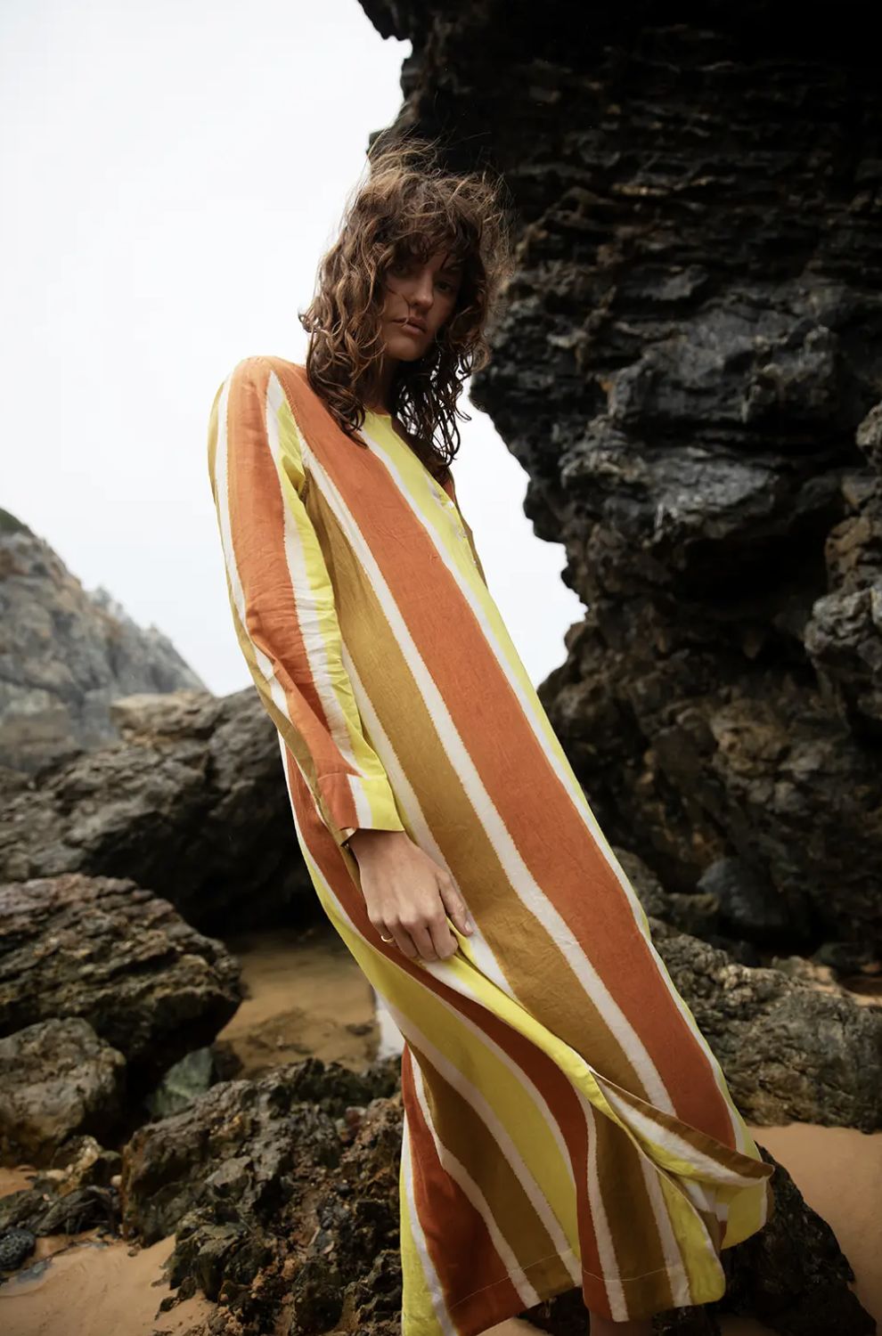 The Bazaar Stripe dress features long sleeves and a throw-on sundress design, with a button-down centre front placket and a scoop hem with side splits that add a playful touch. The dress boasts an artisanal hand-painted stripe technique, adding a unique element to its maxi length design.