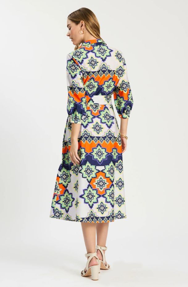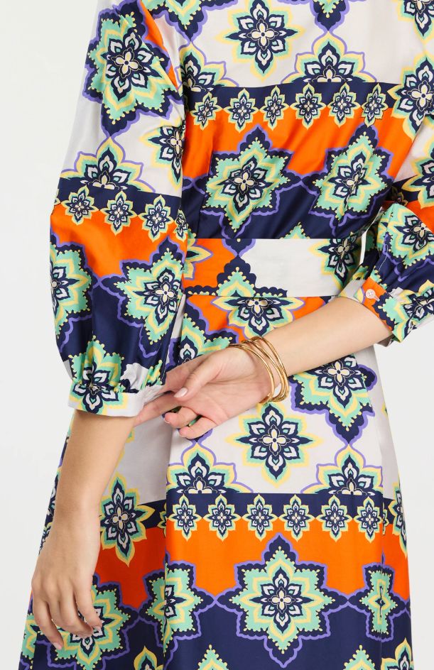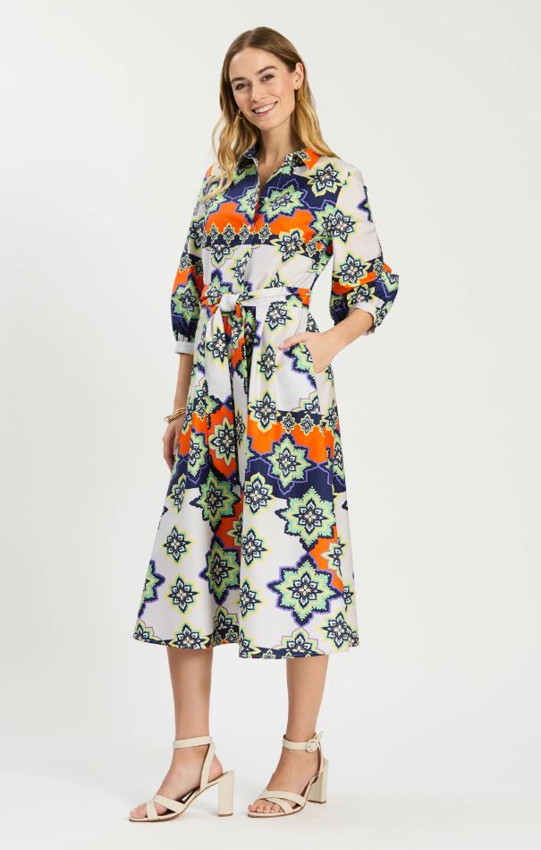 This standout midi dress is designed to make getting dressed effortless and memorable. Featuring a vibrant, artistic print layered with bold florals and geometric motifs, it brings color and personality to a timeless silhouette. The relaxed shape and flattering length make it easy to wear, while the three-quarter sleeves add polish and versatility. Style it with a sandal or heel for daytime events, then dress it up with statement jewelry for evening—this is the kind of piece that does all the work for you.