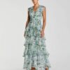 Ethereal elegance meets intricate craftsmanship in this stunning seafoam gown by Mac Duggal. Designed in a delicate embroidered lace, this piece features a flattering V-neckline complemented by soft flutter sleeves for a romantic, feminine touch. The fitted silhouette gently elongates the figure, while shimmering blue and silver embroidery adds dimension and subtle sparkle throughout.