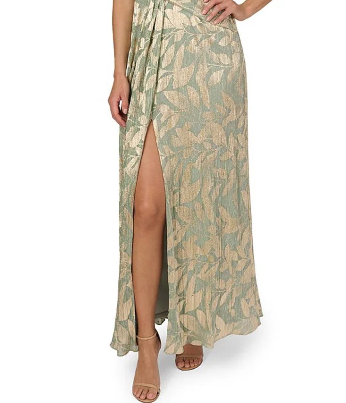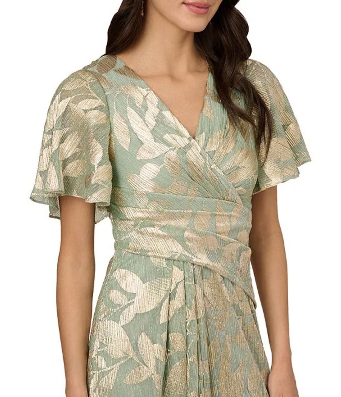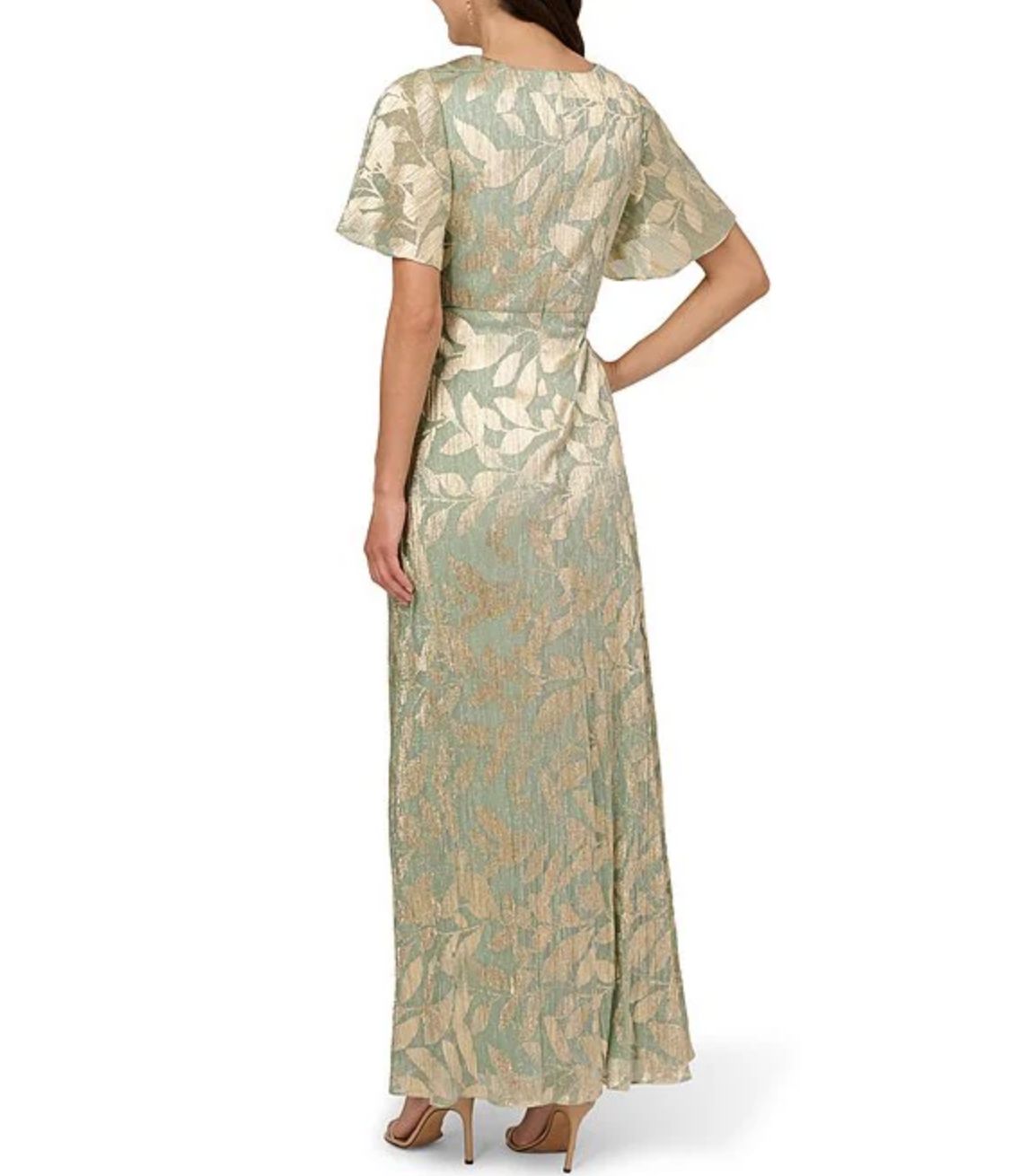 Adrianna Papell Foiled Leaf Print Surplice V-Neck Short Flutter Sleeve Gown | sage/gold – FINAL SALE