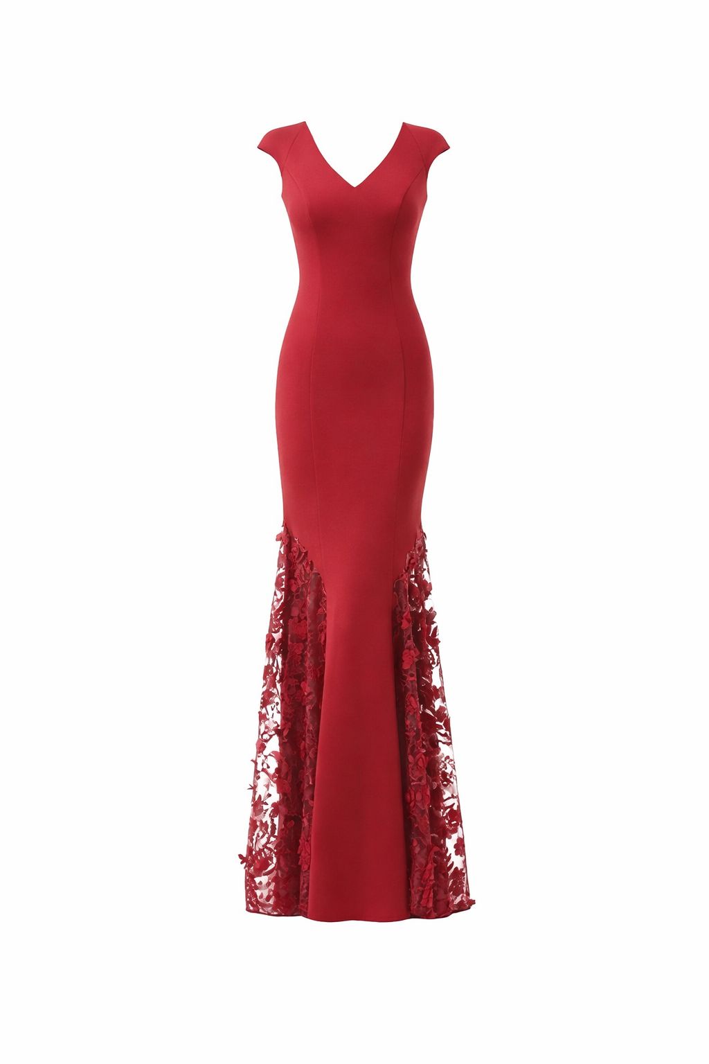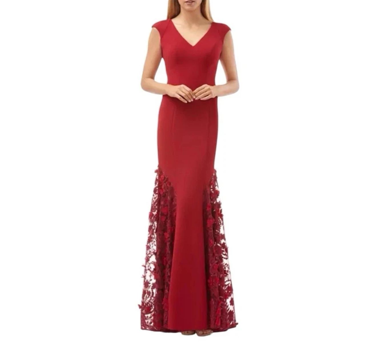 The Carmen Marc Valvo Infusion crepe gown is a striking expression of modern sophistication and timeless glamour. Expertly tailored from smooth, figure-skimming crepe, this floor-length silhouette features a flattering V-neckline and cap sleeves that create a clean, elegant profile. Dramatic 3D floral appliqués cascade from the skirt, adding rich texture and romantic dimension while subtly enhancing movement. Designed to contour the body beautifully, this gown is a stunning choice for black-tie events, formal galas, or unforgettable evening occasions where elevated style is essential.