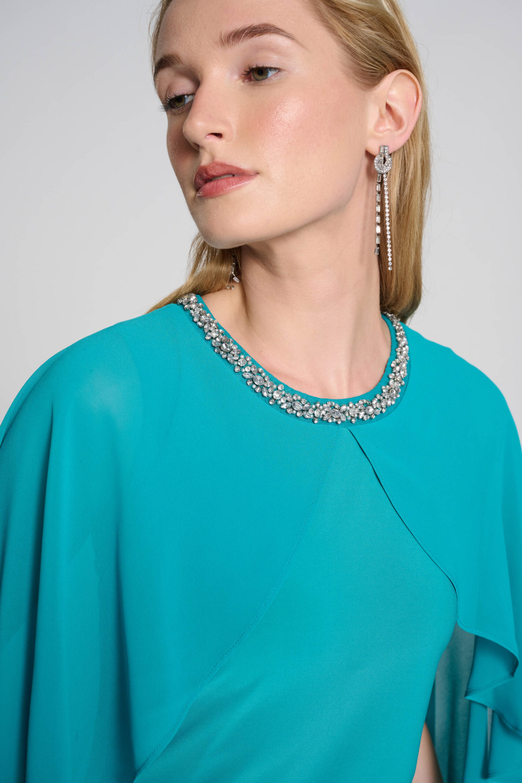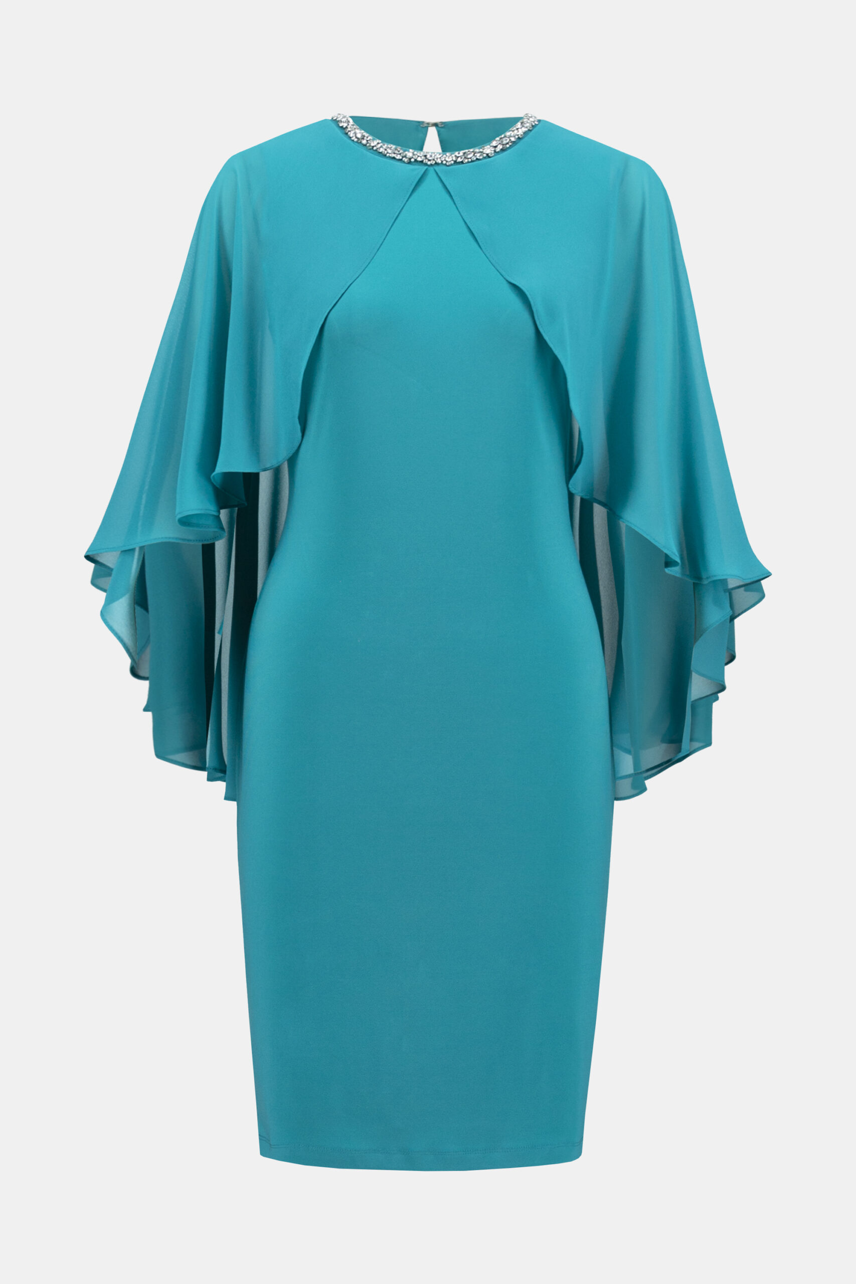 Step into elegance with the Joseph Ribkoff knee-length sheath dress. Ideal for formal events and night outs, this stunning piece features a round neck adorned with jewels. The plain pattern and feminine design are complemented by short flutter sleeves, creating a sophisticated yet stylish look. Perfect for any occasion, this dress effortlessly combines comfort and class.
