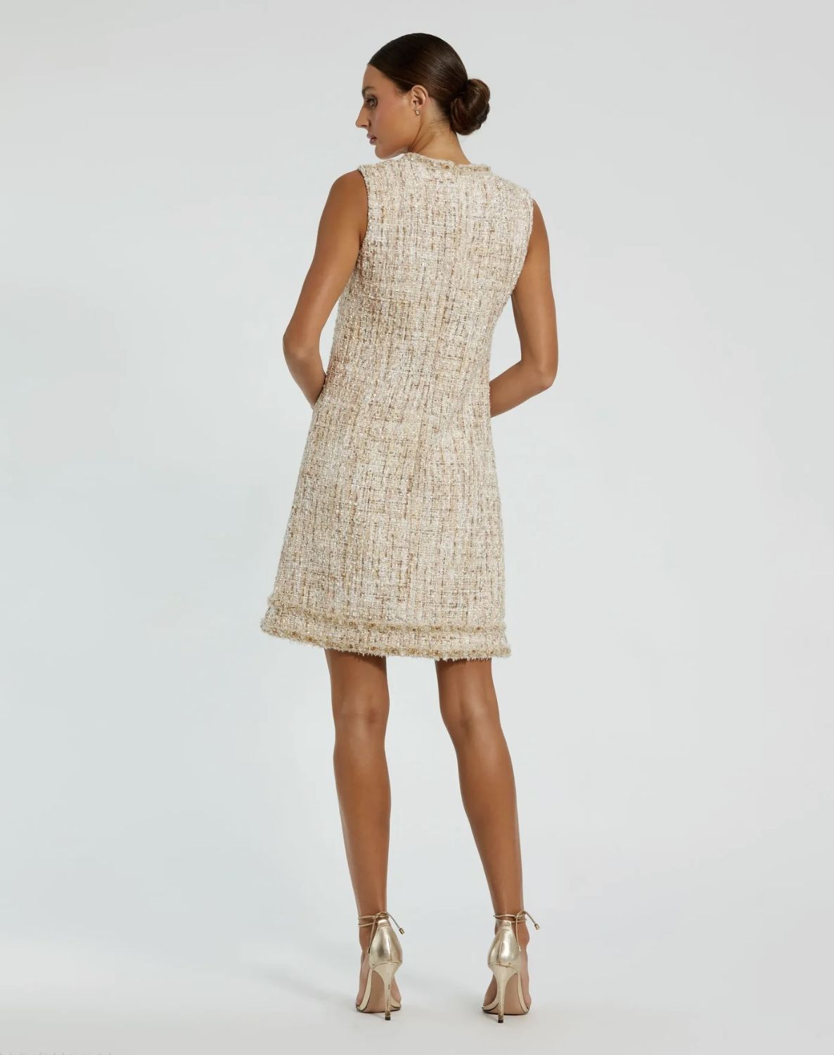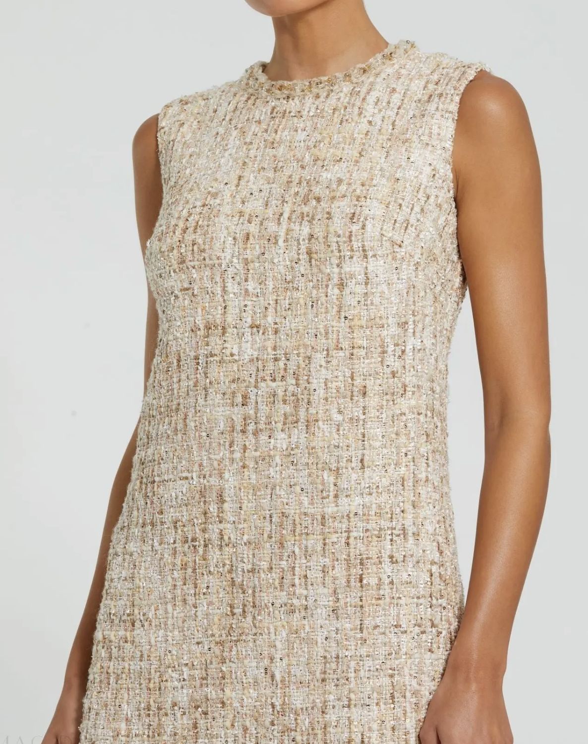 Elevate your style with Mac Duggal’s Beaded Trim A-Line Mini Shift Dress. This chic sleeveless boucle dress features subtle beaded detailing, a flattering A-line silhouette, and a modern shift design, offering both comfort and sophistication.