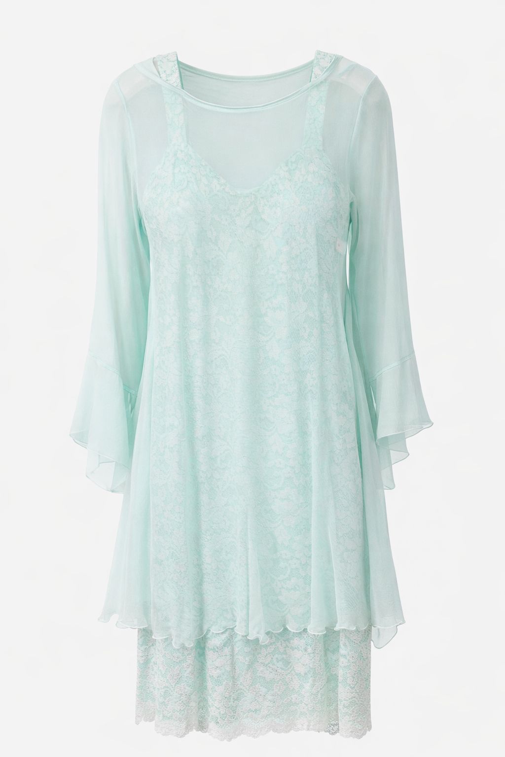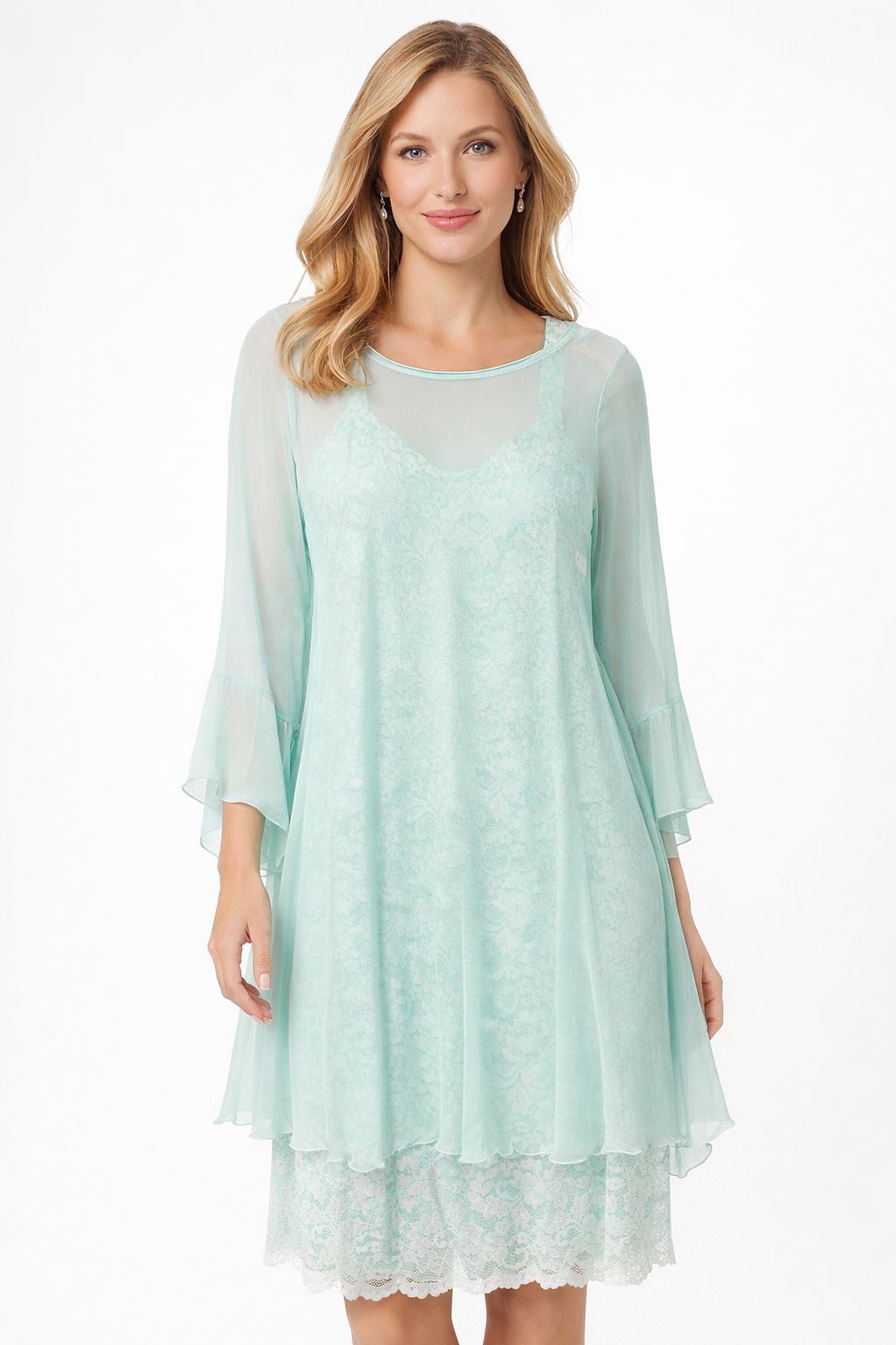 Sara Mique Lace Sheath Dress with Chiffon Overlay in Aquamarine | Style #T1501-D681 – FINAL SALE