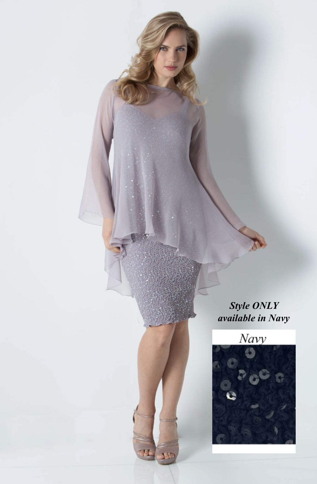 Elevate your evening look with the Sara Mique Silk Pucker With Sequins in NAVY | Style T1501-D1547SCL—a beautifully crafted two-piece ensemble designed to flatter with effortless grace. The body-skimming pucker knit tank dress shimmers with hand-applied sequins, offering soft stretch and a refined, textural finish. A flowing silk plissé float drapes elegantly over the silhouette, creating movement and coverage while maintaining a polished, light-as-air feel.