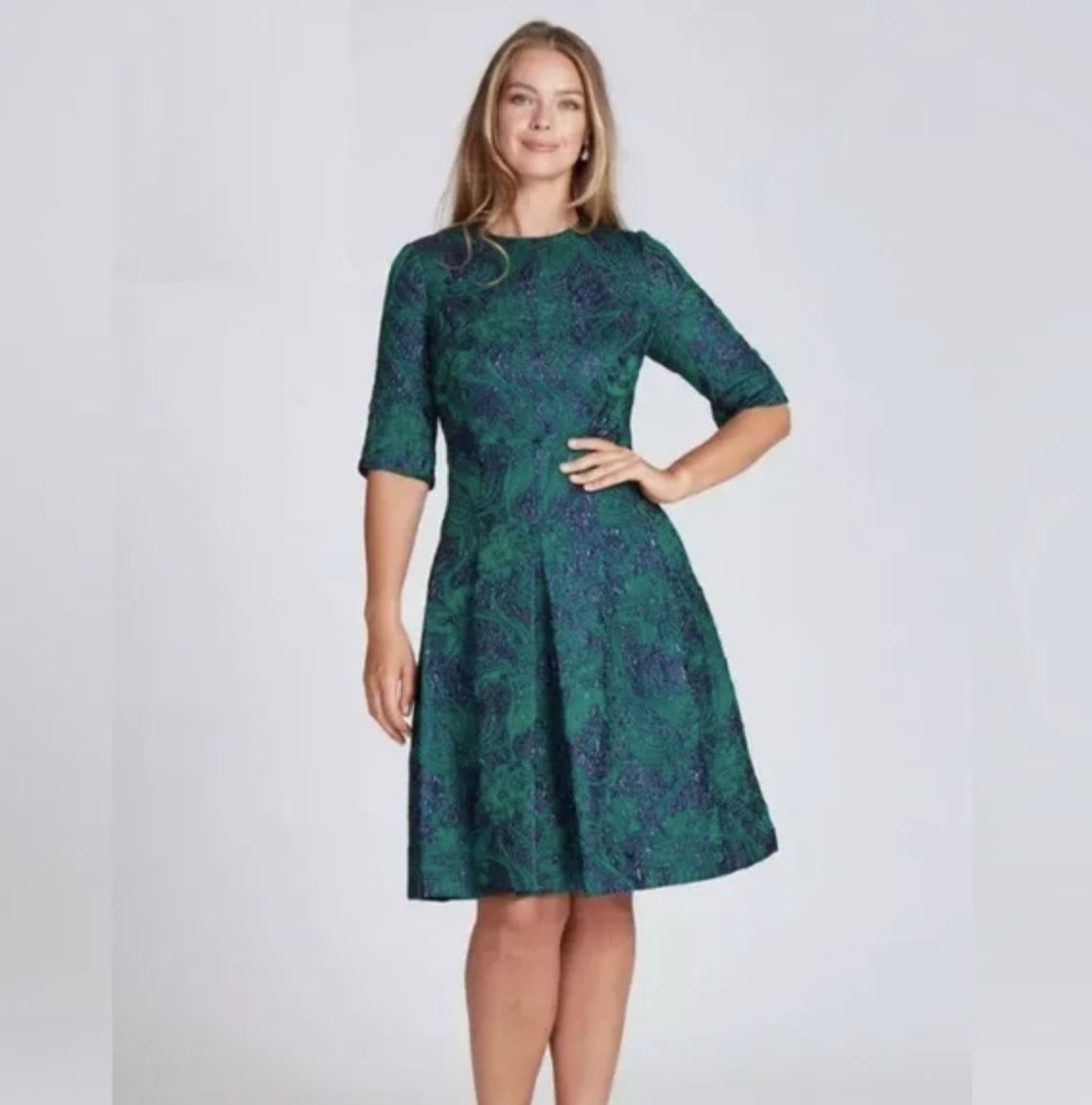 Elevate any special occasion with the timeless elegance of the Teri Jon Floral Jacquard Inverted Pleats Dress. Crafted in a beautifully textured floral jacquard, this dress features expertly placed inverted pleats that create a refined, feminine silhouette with graceful movement. The structured bodice offers a flattering fit, while the full skirt adds just the right touch of sophistication. Perfect for daytime events, luncheons, weddings, and celebrations, this dress combines classic charm with polished versatility—an effortless choice for women who appreciate elevated style.
