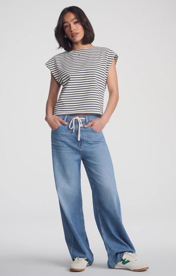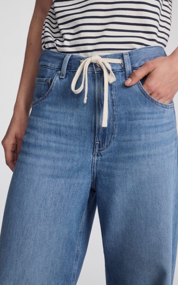 Nella features a loose wide leg and high rise, finished with an adjustable drawstring. Blending comfort with a bold look, it offers relaxed movement through the leg while keeping a defined waist. This pair comes in a versatile light blue wash with subtle whiskering.
