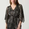 Strike the perfect balance between relaxed and refined style with this silky knit top. An alluring abstract print adorns the garment’s beautiful boxy silhouette. The slit neckline and mandarin collar as well as the three-quarter dolman sleeves lend the modern design its polished look that can easily be dressed up or down on any occasion.