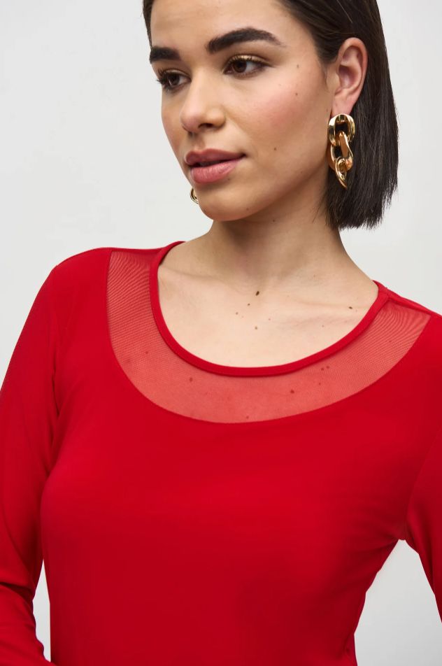 Joseph Ribkoff Lipstick Red Silky Knit and Mesh Fitted Top | Style 244066 – FINAL SALE